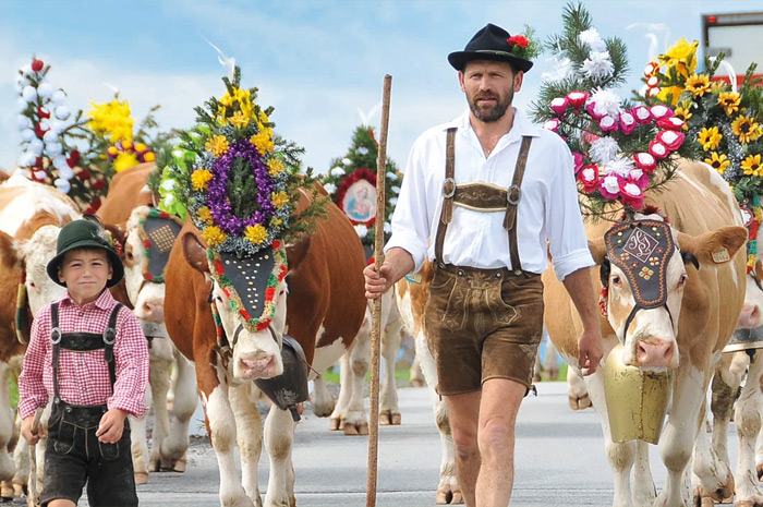 Les fêtes de la transhumance rythment la fin de l’été au Tyrol. Pour descendre des alpages, les vaches défilent parées de leurs plus beaux atours. L’Ecomusée de Kramsach organise chaque année à cette époque une fête paroissiale haute en couleurs : défilé des groupes de musique en costumes traditionnels, stands de produits gourmands dans une ambiance festive.